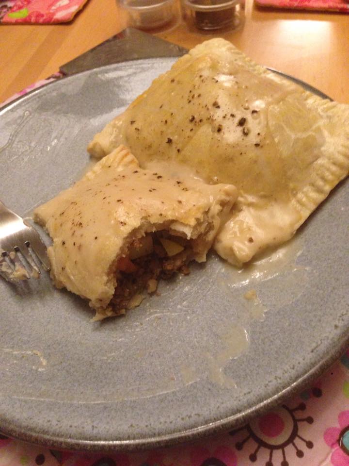 My sweetie made the dough for the crust from scratch, as well as the filing. Then when I got home, i helped row out the dough and cut it into squares (managing to spread flour EVERYWHERE in the process) and then he filled them. I also made gravy, I forgot to buy beef broth so I used bouillon, but it all turned out delicious any way.