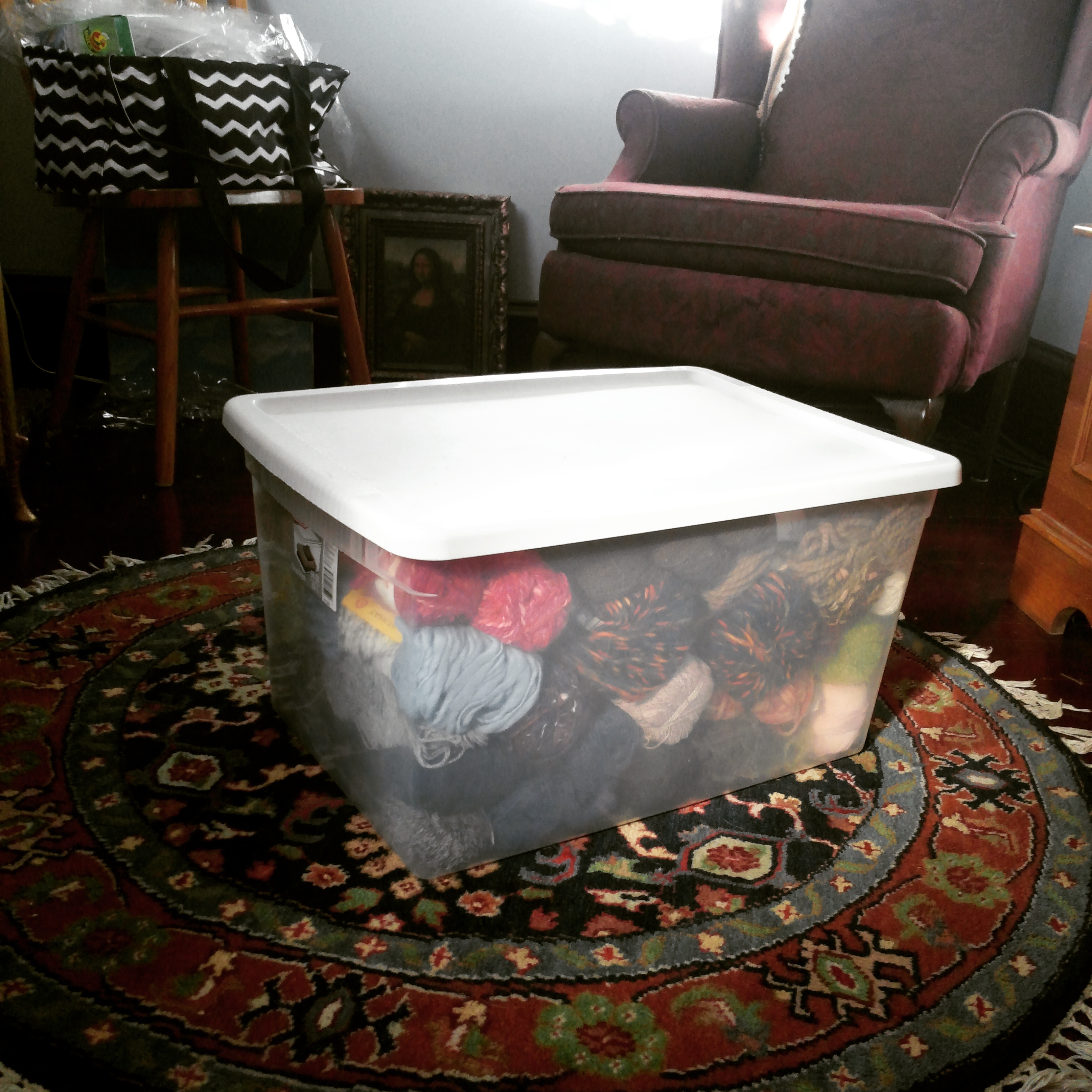 So I’ve put myself on a yarn buying freeze, (unless it’s super clearance or I NEED it for a paid project), and my goal is to empty one of the six 66 quart totes I currently have stuffed full of yarn. Ideally this will create space for all the yarn hanging out in baskets and boxes into either a tote or onto my shelves and off of my floor. If I could create some breathing room on my selves in the craft room that would be nice too, right now I have yarn shoved into the space on top of my books. And have to resort every time I bring anything new home.