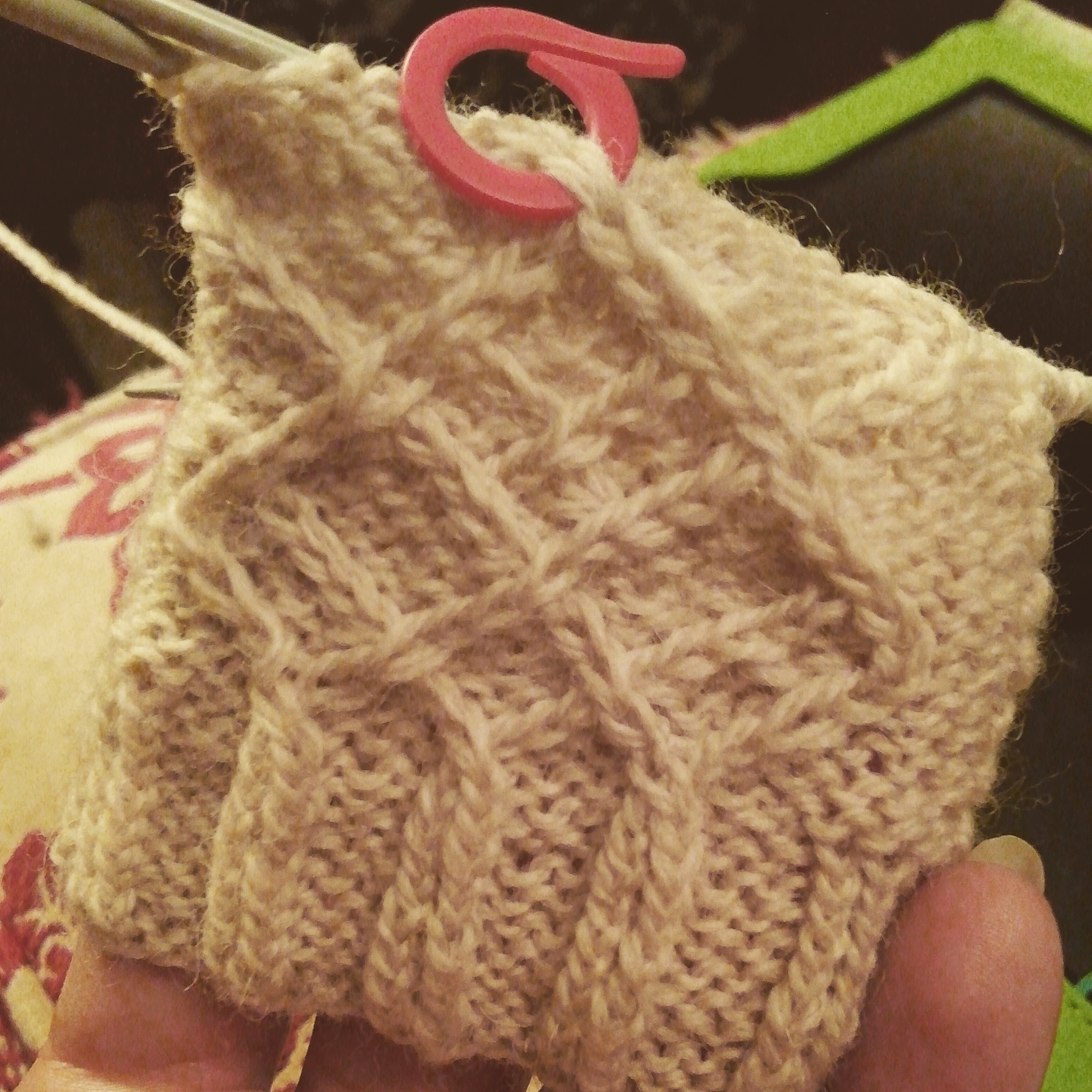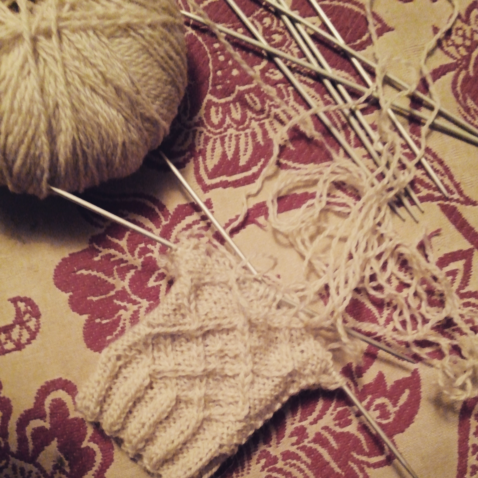 Friday I was out of it. First I completely forgot the increases, so I altered my cables so I only had to frog a few rows, and started again. Then when I thought it was all good and while placing my stitches for the thumb on a stitch holder I realized I had done the increases for the right AND left gloves on the same glove.
